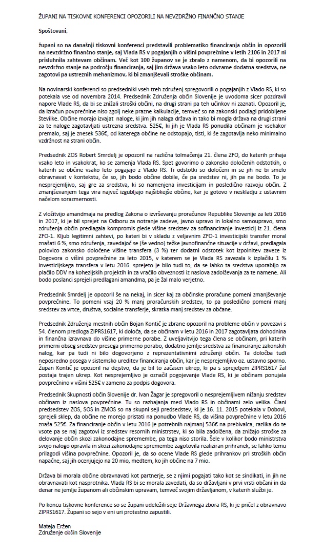 Župani na tiskovni konferenci opozorili na nevzdržno finančno stanje